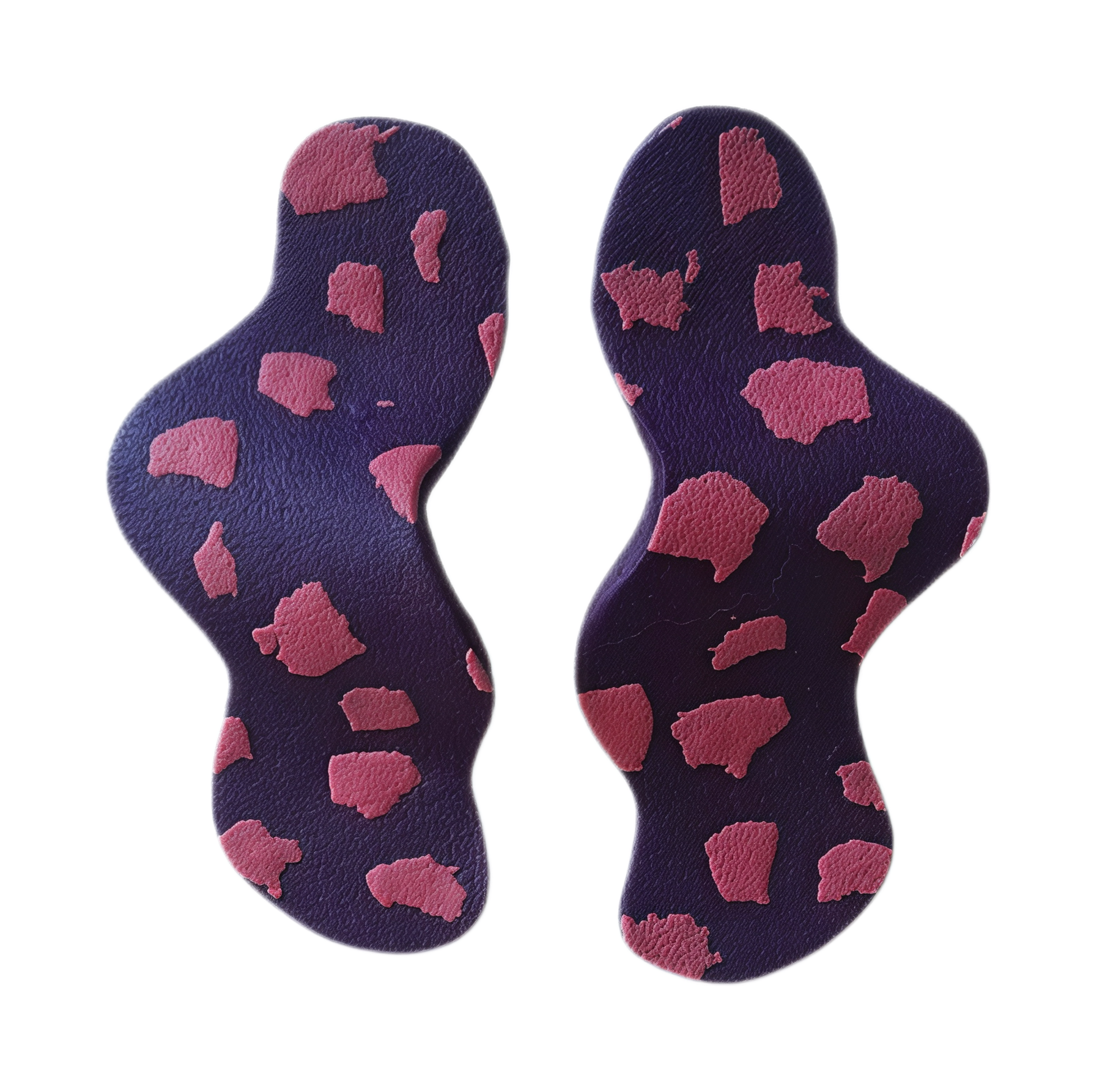Paleta: Presentan un fondo en Púrpura Oscuro/Azul Marino Profundo, sobre el cual se dispersan manchas o fragmentos irregulares en un vibrante tono Rosa Fucsia/Magenta. Este patrón evoca la estética del animal print abstracto o un terrazzo cósmico.